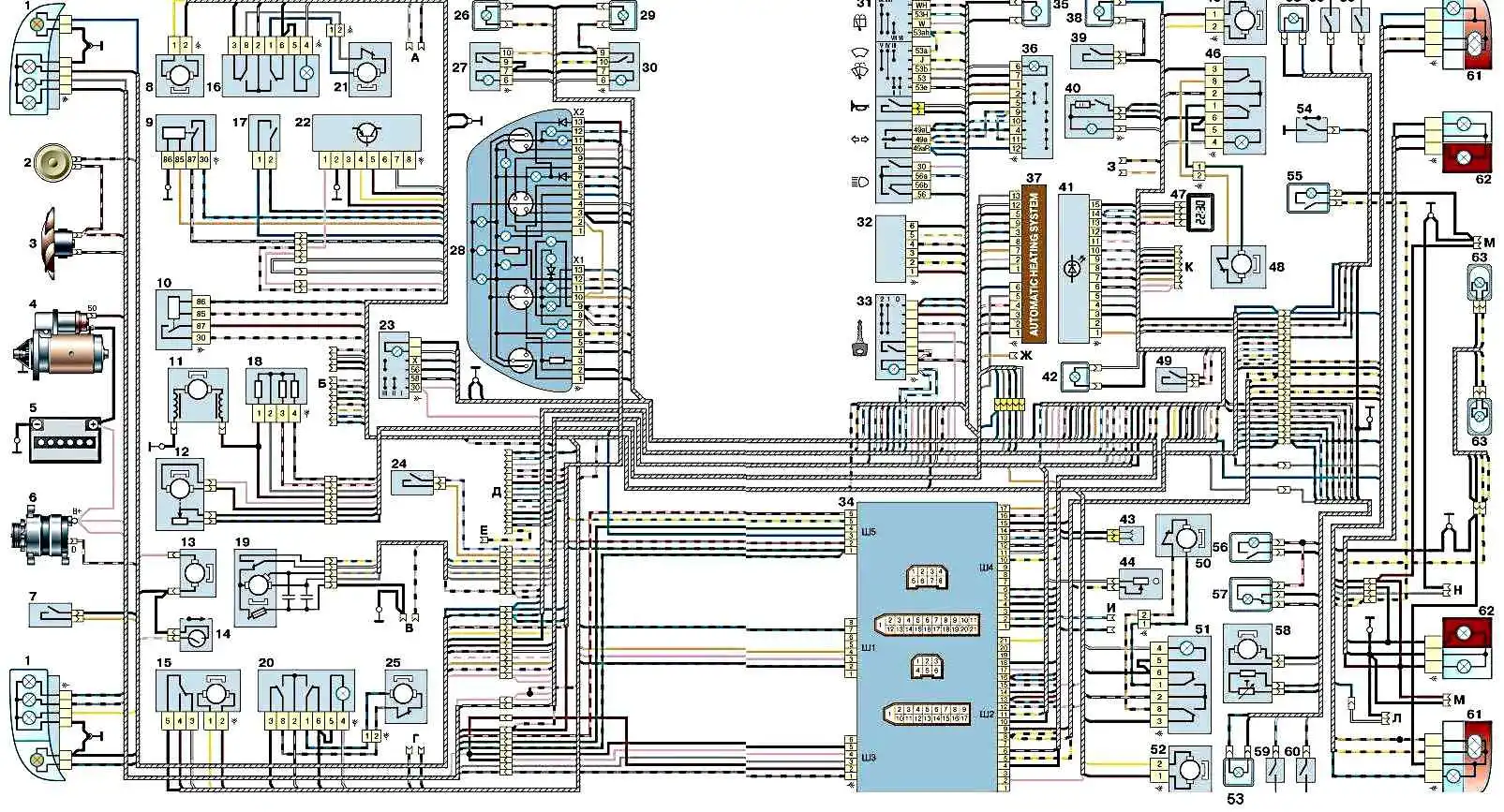 Схема электрооборудования ВАЗ-2110 «седан»: 1 – блок-фары 2 – звуковой сигнал 3 – электродвигатель вентилятора системы охлаждения двигателя 4 – стартер 5 – аккумуляторная батарея 6 – генератор 7 – выключатель света заднего хода 8 – электропривод блокировки замка правой передней двери 9 – реле включения электростеклоподъемников 10 – реле включения стартера 11 – электродвигатель отопителя 12 – микромотор-редуктор привода заслонки отопителя 13 – электродвигатель омывателя ветрового стекла 14 – датчик уровня омывающей жидкости 15 – электропривод блокировки замка левой передней двери 16 – переключатель электростеклоподъемника правой передней двери 17 – электропривод замка багажника 18 – дополнительный резистор электродвигателя вентилятора отопителя 19 – мотор-редуктор очистителя ветрового стекла 20 – переключатель электростеклоподъемника левой передней двери 21 – электропривод стеклоподъемника правой передней двери 22 – блок управления системы блокировки замков дверей 23 – переключатель наружного освещения 24 – датчик уровня тормозной жидкости 25 – электропривод стеклоподъемника левой передней двери 26 – контрольная лампа включения противотуманного света 27 – выключатель противотуманного света 28 – комбинация приборов 29 – контрольная лампа обогрева заднего стекла 30 – выключатель обогрева заднего стекла 31 – подрулевой переключатель 32 – реле включения противотуманного света 33 – выключатель зажигания 39 – выключатель лампы освещения вещевого ящика 40 – прикуриватель 41 – блок индикации бортовой системы контроля 42 – лампа освещения пепельницы; 43 – розетка для переносной лампы 44 – выключатель освещения приборов 45 – электропривод блокировки замка правой задней двери 46 – переключатель электростеклоподъемника правой задней двери 47 – часы 48 – электропривод стеклоподъемника правой задней двери 49 – выключатель сигналов торможения 50 – электропривод стеклоподъемника левой задней двери 51 – переключатель электростеклоподъемника левой задней двери 52 – электропривод блокировки замка левой задней двери 53 – боковые указатели поворота 54 – выключатель контрольной лампы стояночного тормоза 55 – фонарь освещения багажного отсека 56 – плафон индивидуального освещения 57 – плафон освещения салона 58 – датчик температуры системы отопления 59 – выключатели в стойках передних дверей 60 – выключатели в стойках задних дверей 61 – наружные задние фонари 62 – внутренние задние фонари 63 – фонари освещения номерного знака А – колодки для подключения правой передней колонки Б – колодки для подключения аудиоаппаратуры В – колодки для подключения электродвигателя омывателя заднего стекла Г – колодки для подключения левой передней колонки Д – колодка для подключения жгута проводов системы впрыска Е - разъем для диагностики электроусилителя руля Ж – разъем для диагностики системы автоматического управления отопителем З - колодки для подключения правой задней колонки И - колодки для подключения левой задней колонки К – колодка для подключения бортового компьютера Л – к электроприводу замка багажника М – колодки для подключения дополнительных сигналов 34 – монтажный блок 35 – лампа подсветки рычагов управления отопителем 36 – выключатель аварийной сигнализации 37 – контроллер системы автоматического управления отопителем 38 
