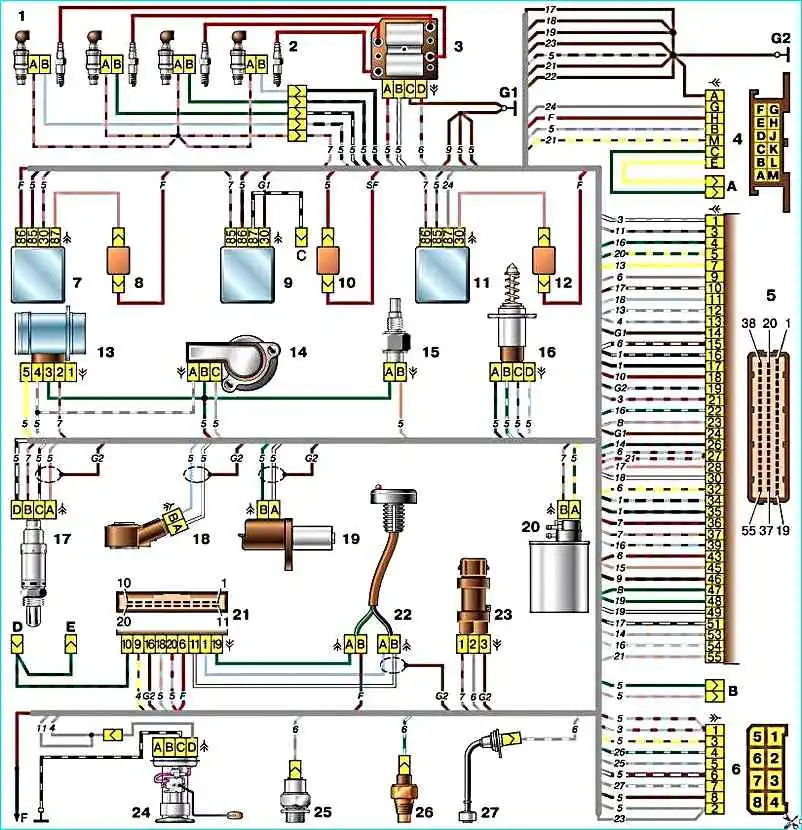 Схема соединений системы управления двигателем ВАЗ-2111 (контроллер МР7.0): 1 – свечи зажигания 2 – форсунки 3 – модуль зажигания 4 – контроллер 5 – главное реле 6 – предохранитель, соединенный с главным реле 7 – реле электровентилятора системы охлаждения 8 – предохранитель, соединенный с реле электровентилятора системы охлаждения 9 – реле электрического топливного насоса 10 – предохранитель, соединенный с реле электрического топливного насоса 11 – датчик массового расхода и температуры воздуха 12 – датчик неровной дороги 13 – датчик положения дроссельной заслонки 14 – датчик температуры охлаждающей жидкости 15 – регулятор холостого хода 16 – управляющий датчик кислорода 17 – диагностический датчик кислорода 18 – электромагнитный клапан продувки адсорбера 19 – датчик детонации 20 – датчик положения коленчатого вала 21 – блок управления иммобилайзера 22 – индикатор состояния иммобилайзера 23 – датчик фаз 24 – датчик скорости автомобиля 25 – модуль электрического топливного насоса с датчиком уровня топлива 26 – датчик контрольной лампы давления масла 27 – датчик указателя температуры охлаждающей жидкости А – колодка, присоединяемая к жгуту салонной группы АБС Б – колодка диагностики В – колодка, присоединяемая к жгуту проводов кондиционера Г – к выводу "+" аккумуляторной батареи Д – к колодке жгута проводов боковых дверей Е– колодка, присоединяемая к жгуту проводов панели приборов G1, G2 – точки заземления I – порядок условной нумерации контактов в колодке блока управления иммобилайзера II – порядок условной нумерации контактов в колодке диагностики