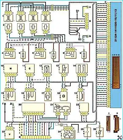 Схема соединений системы управления двигателем ВАЗ-21124 с распределенным впрыском топлива под нормы токсичности Евро-3 (контроллер M7.9.7): 1 – катушки зажигания; 2 – форсунки; 3 – контроллер; 4 – главное реле; 5 – предохранитель, соединенный с главным реле; 6 – реле электровентилятора системы охлаждения; 7 – предохранитель, соединенный с реле электровентилятора системы охлаждения; 8 – реле электрического топливного насоса; 9 – предохранитель, соединенный с реле электрического топливного насоса; 10 – датчик массового расхода и температуры воздуха; 11 – датчик неровной дороги; 12 – датчик положения дроссельной заслонки; 13 – датчик температуры охлаждающей жидкости; 14 – регулятор холостого хода; 15 – управляющий датчик кислорода; 16 – диагностический датчик кислорода; 17 – электромагнитный клапан продувки адсорбера; 18 – датчик детонации; 19 – датчик положения коленчатого вала; 20 – блок управления иммобилайзера; 21 – индикатор состояния иммобилайзера; 22 – датчик фаз; 23 – датчик скорости автомобиля; 24 – модуль электрического топливного насоса с датчиком уровня топлива; 25 – датчик контрольной лампы давления масла 26 – датчик указателя температуры охлаждающей жидкости; А – колодка, присоединяемая к жгуту проводов салонной группы АБС; Б – колодка диагностики; В – колодка, присоединяемая к жгуту проводов кондиционера; Г – к выводу "+" аккумуляторной батареи; Д – к колодке жгута проводов боковых дверей; Е – колодка, присоединяемая к жгуту проводов панели приборов G1, G2 – точки заземления I – порядок условной нумерации штекеров в колодке блока управления иммобилайзера II – порядок условной нумерации контактов в колодке диагностики