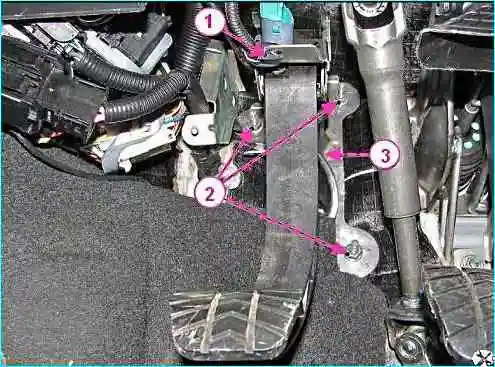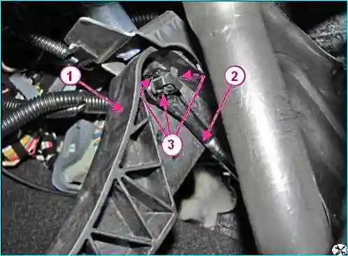 - - поворачиваем выключатель 2 сигнала положения педали сцепления на 90˚ против часовой стрелки и извлекаем его из отверстия в кронштейне 3 крепления педали сцепления.
