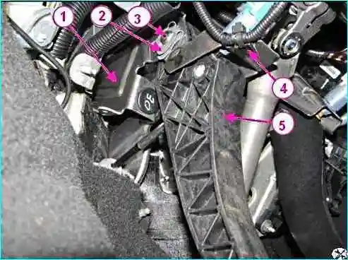 Отсоединяем скобу 4 крепления жгута проводов от кронштейна 1 педали сцепления и убираем жгут проводов из зоны проведения работ.