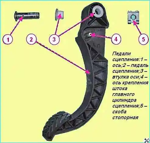 Плоской отверткой снимаем стопорную скобу 2, рисунок 3, извлечь ось 3 и снять педаль сцепления.