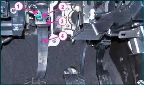 Нажать на педаль 4, рисунок 1, сцепления, установить выключатель 2, сигнала положения педали сцепления в отверстие кронштейна 3 педали сцепления и повернуть до упора по часовой стрелке.