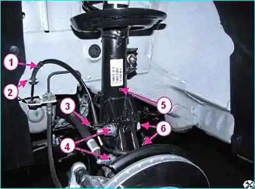 Отсоединение поворотного кулака от стойки передней подвески: 1 - кронштейны крепления жгута проводов датчика скорости колеса на кузове; 2 – жгут проводов датчика скорости колеса; 3 - кронштейн крепления жгута проводов датчика скорости колеса на стойке передней подвески; 4 - гайка болта крепления поворотного кулака к стойке передней подвески; 5 - стойка передней подвески; 6 болт крепления поворотного кулака к стойке передней подвески