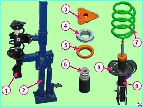 Разборка стойки передней подвески: 1- стойка передней подвески с пружиной и верхней опорой в сборе; 2 - приспособление для разборки стоек передней подвески; 3 - опора верхняя; 4 - подшипник; 5 - прокладка изолирующая; 6 – буфер хода сжатия с защитным кожухом в сборе: 7 - пружина передней подвески; 8 – стойка передней подвески; 9 - упор пружины передней подвески