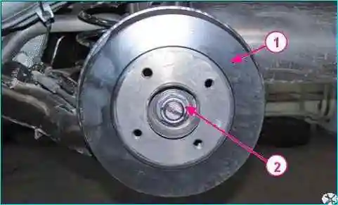 Снятие тормозного барабана: 1 - барабан тормозной; 2 - колпак ступицы
