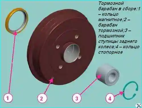 Тормозной барабан в сборе: 1 - кольцо магнитное; 2 - барабан тормозной; 3 - подшипник ступицы заднего колеса; 4 - кольцо стопорное