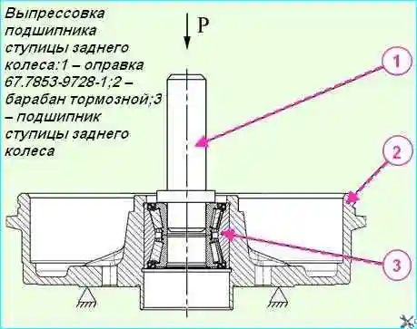 Устанавливаем тормозной барабан 2, рисунок 4, на стол пресса, устанавливаем на подшипник оправку 1 и выпрессовываем подшипник 3 ступицы заднего колеса из тормозного барабана.
