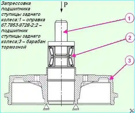 Запрессовка подшипника ступицы заднего колеса: 1 - оправка; 2 - подшипник ступицы заднего колеса; 3 - барабан тормозной