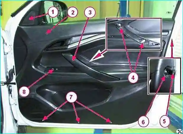 Крепление обивки правой передней двери: 1 облицовка внутренняя наружного зеркала; 2 - обивка правой передней двери; 3 – облицовка ручки обивки передней правой двери; 4 - винты крепления ручки двери; 5 – заглушка; 6 – винт верхнего крепления обивки двери; 7 - винты нижнего крепления обивки двери; 8 — переключатель стеклоподъемника