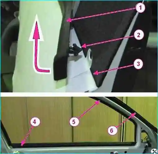 Уплотнители двери: 1 - наружный горизонтальный уплотнитель опускного стекла двери; 2 – фиксатор наружного уплотнителя; 3 – дверь передняя; 4 - внутренний горизонтальный уплотнитель опускного стекла двери; 5 верхний уплотнитель стекла двери; 6 – уплотнитель рамки двери опускного стекла