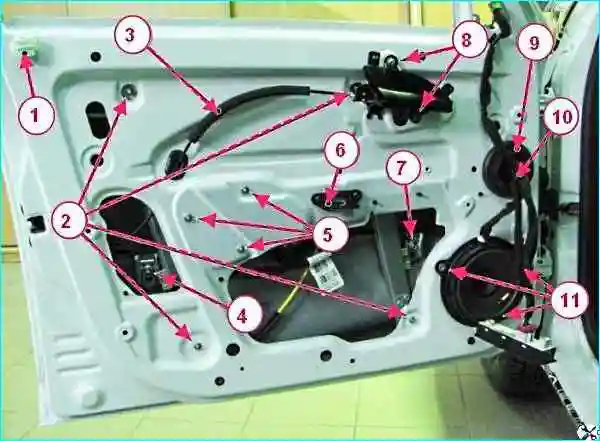 Арматура двери: 1 - держатель винта крепления обивки; 2 – гайки крепления направляющих стеклоподъемника; 3 - трос внутренней ручки привода замка двери; 4, 7 - болты зажимов стекла; 5 - гайки крепления стеклоподъемника; 6 - кронштейн ручки обивки двери; 8 – винты крепления ручки замка внутренней; 9 – уплотнитель жгута проводов; 10 - жгут проводов двери; 11 - заклепки крепления громкоговорителя