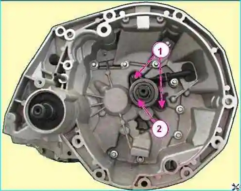 Установить муфту 2, рисунок 5, выключения сцепления в сборе с рабочим цилиндром сцепления в коробку передач и завернуть два болта 1 крепления.