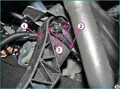 Отсоединение штока главного цилиндра сцепления: 1 - педаль сцепления; 2 – шток главного цилиндра сцепления; 3 - фиксаторы головки штока главного цилиндра сцепления