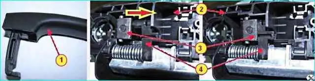 Для демонтажа ручки наружной замка двери, необходимо взяться за ручку и не оттягивая ее сдвинуть назад, затем в сдвинутом положении потянуть заднюю часть ручки до выхода заднего зацепа из отверстия в панели двери и потянув за ручку с усилием, преодолевающим усилие шарнирного фиксатора передней части ручки снять ручку, рисунок 8.