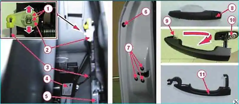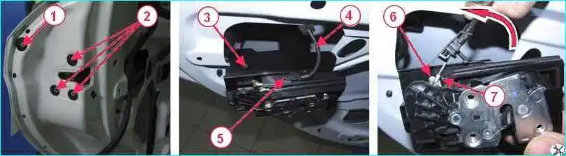 Головкой Torx T30 отворачиваем винты 7 крепления ручки 5 внутренней замка двери, снимаем ручку, отсоединив от нее трос 4.