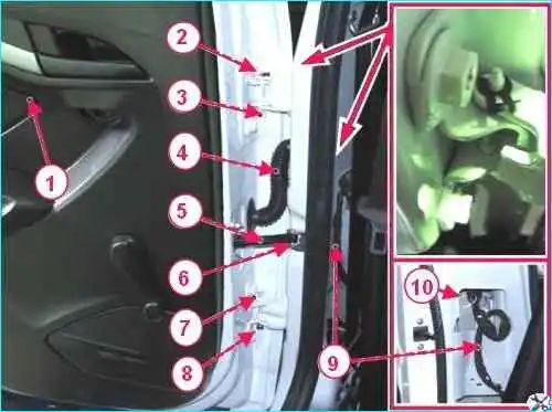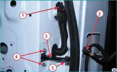Отсоединяем колодку 10, рисунок 2, жгута 9 проводов заднего от колодки жгута проводов двери, извлекаем защитную трубку 4 жгута проводов двери, а затем и жгут проводов из отверстия в стойке кузова.