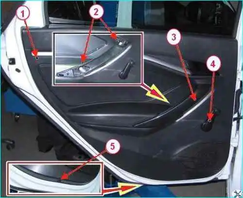 Снимаем декоративную заглушку 3 и отворачиваем винты 2 крепления ручки обивки двери, снимаем ручку.
