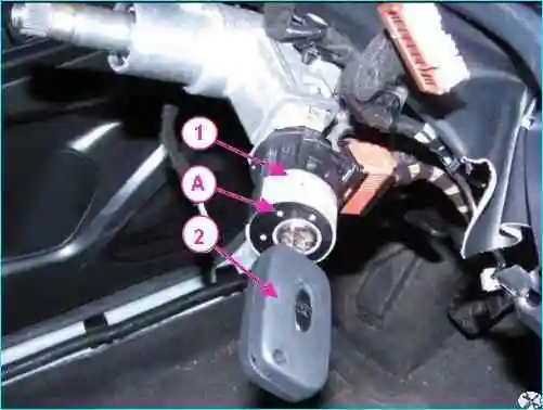 Установить ключ 2, рисунок 2, выключателя зажигания в положение "А", утопить фиксатор 2, рисунок 3, и установить выключатель зажигания в корпус вала рулевого управления.
