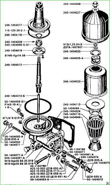 На рисунке представлены места установки деталей и их обозначения по каталогу запасных частей