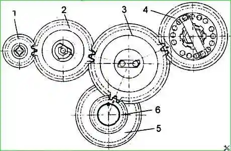 После закрепления промежуточной шестерни боковой зазор между зубьями шестерен распределения должен быть в пределах 0,1-0,3 мм.