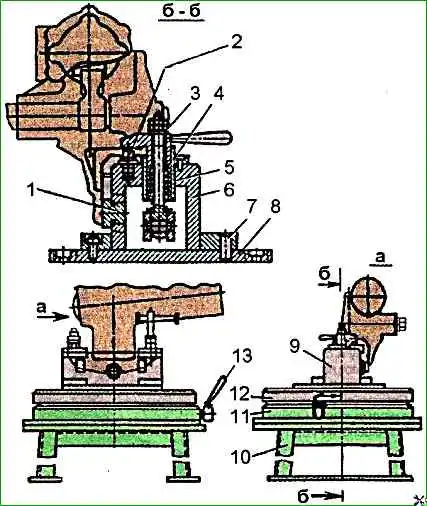 Стенд для сборки и разборки механизма рулевого усилителя: 1 – упор; 2 – палец-фиксатор; 3 – прихват с рукояткой в сборе; 4 – пружина; 5 – втулка; 6 – корпус; 7 – установочный штифт; 8 – плита; 9 – приспособление для крепления картера рулевого механизма; 10 – основание стенда; 11 – неподвижная плита; 12 – поворотная плита; 13 – рычаг запорного механизма поворотной плиты