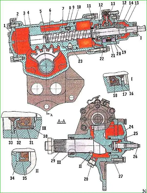 Детали механизма рулевого управления: 1 – нижняя крышка; 2 – уплотнительное кольцо; 3 – картер рулевого механизма; 4 – поршень-рейка; 5 – уплотнительное разрезное кольцо; 6 – винт рулевого управления; 7 – шариковая гайка; 8 – желоб; 9 – шарик; 10 – уплотнительное (фторопластовое) и подпорное (резиновое) кольца; 11 – промежуточная крышка; 12 – упорный шариковый подшипник; 13 – предохранительный клапан; 14 – регулировочная гайка; 15 – верхняя крышка; 16, 33 – стопорные кольца; 17, 32 – наружные уплотнения; 18, 27, 31, 35 – уплотнительные манжеты; 19 – корпус клапана управления; 20 – золотник; 21 – пружина; 22 – реактивный плунжер; 23 – установочный винт; 24 – боковая крышка; 25 – упорная шайба; 26 – регулировочный винт; 28 – пробка сливного отверстия с магнитом; 29 – вал сошки; 30 – упорное кольцо; 34 – упорная шайба