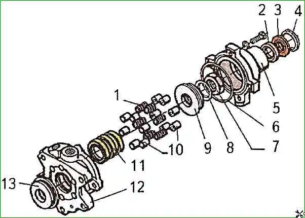 Вынуть из корпуса клапана (с обеих сторон) двенадцать реактивных плунжеров 10 (см. рис.3), шесть реактивных пружин 1 и золотник 11. детали клапана надо аккуратно разложить на лотке или поддоне.