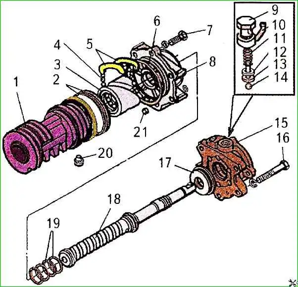 Детали рулевого механизма: 1 – поршень-рейка; 2 – поршневое кольцо; 3 – шариковая гайка; 4 – шарик; 5 – желоб; 6 – уплотнительные кольца; 7, 16 – болты; 8 – промежуточная крышка; 9 – болт перепускного клапана; 10 – угольник; 11 – пружина; 12 – регулировочная прокладка; 13 – направляющая пружины; 14 – шарик предохранительного клапана; 15 – клапан управления; 17 – упорный шариковый подшипник; 18 – винт рулевого механизма; 19 – уплотнительные кольца; 20 – установочный винт; 21 – втулка